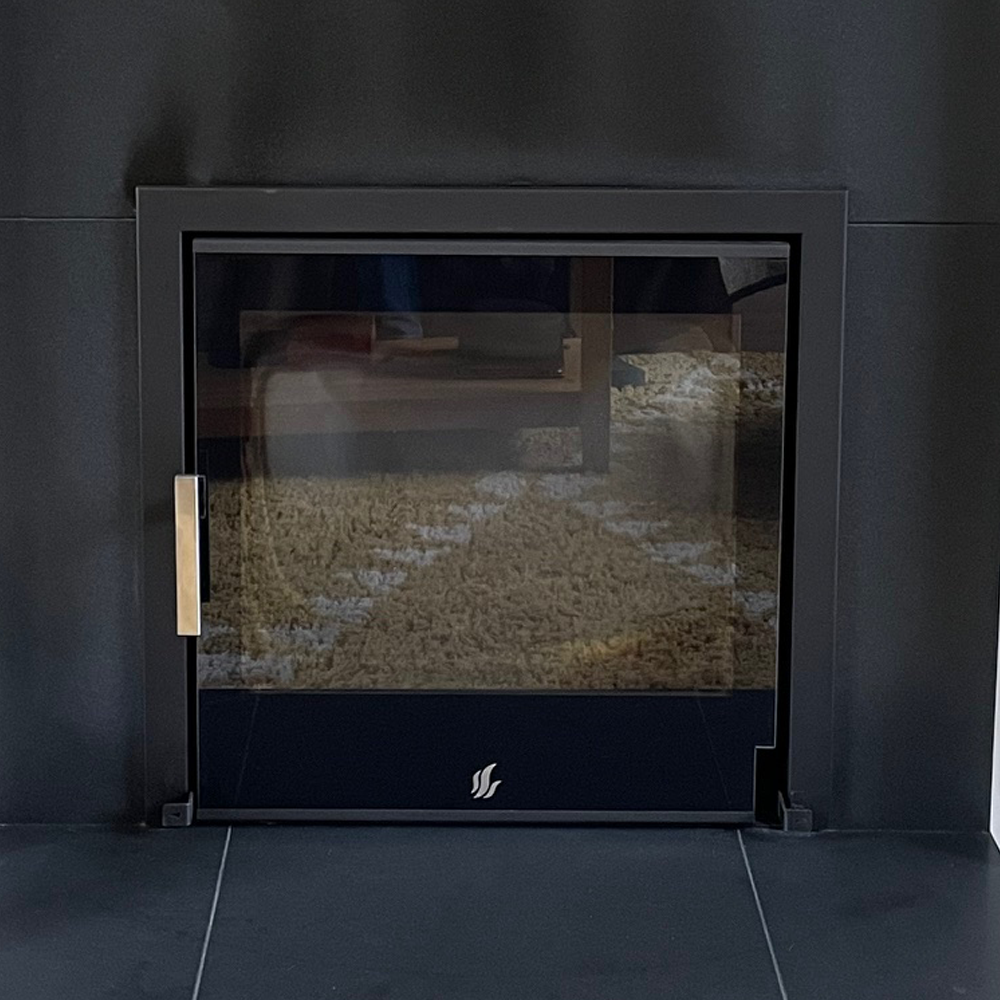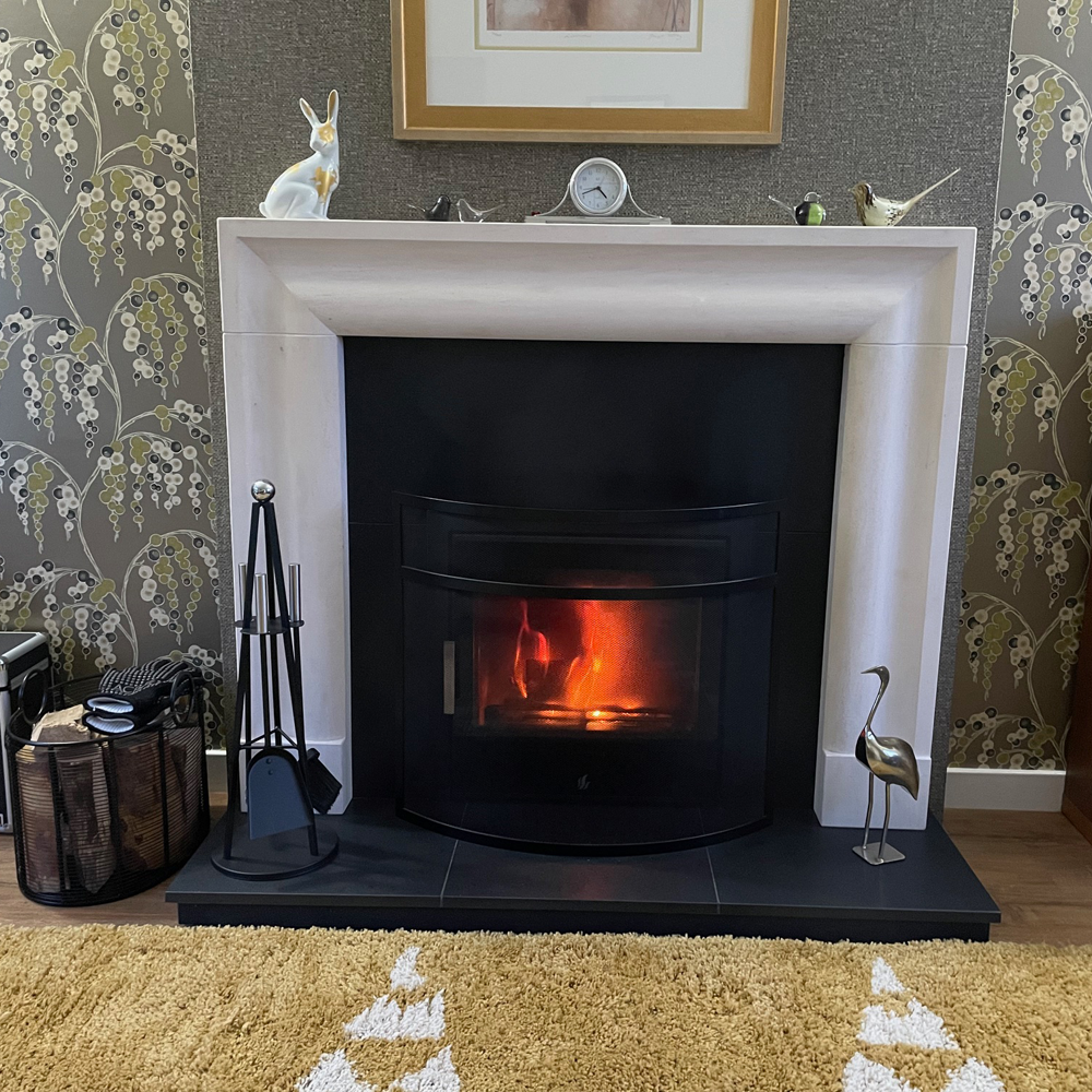 This customer opted to replace their complete fireplace, to one that would accommodate an inset multifuel stove. The stove we installed is the ACR Tenbury T550 ECO-BG stove that features a sleek black glass door and gives a clear, uninterrupted view of the flames. The sophisticated Penman Arlington mantel in Portuguese Limestone, complete with bespoke honed black granite hearth and back panel, complete the look.